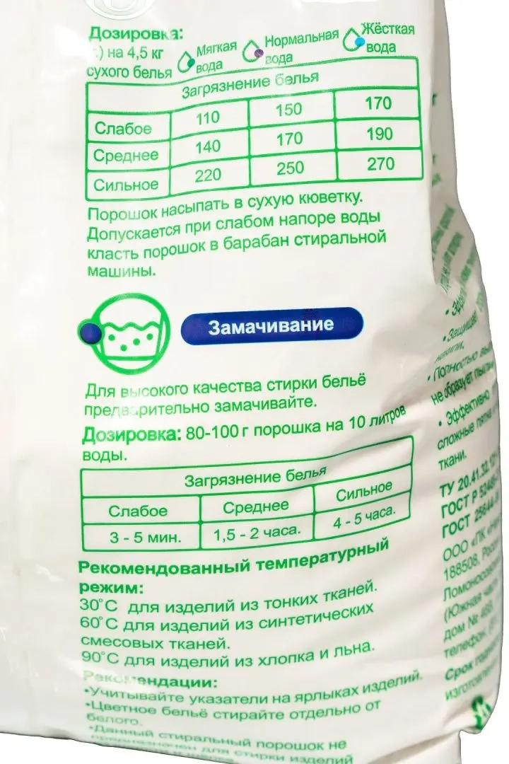 Стиральный порошок предназначен для стирки цветных и белых изделий из хлопчатобумажных, льняных, синтетических тканей, а также тканей из смешанных волокон. Не подходит для стирки изделий из шерсти и шелка.Состав:10-15% карбонаты, 5-15% анионные ПАВ, 5-10% кислородный отбеливатель, менее 5% неиногенные ПАВ, 3% мыло, поликарбоксилаты, фосфонаты, оптический отбеливатель, энзимы, парфюмерная композиция.Расходуется в несколько раз экономичнее других стиральных порошковНе содержит фосфатовНе оставляет следов на одеждеУдаляет все пятнаБережно относится к цветным вещамНе содержит хлора