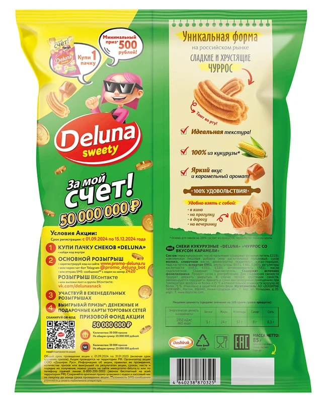 Кукурузные воздушные сладкие снеки Deluna: эксклюзивная необычная форма - чуррос, популярный вкус - карамель, нежная текстура - снеки таят во рту, привлекательная упаковка и стильный дизайн. Представляет собой уникальное сочетание традиционного вкуса и инновационного подхода к производству. Вкус карамели добавляет этим чипсам особый шарм, делая их идеальным выбором для любителей сладких закусок.