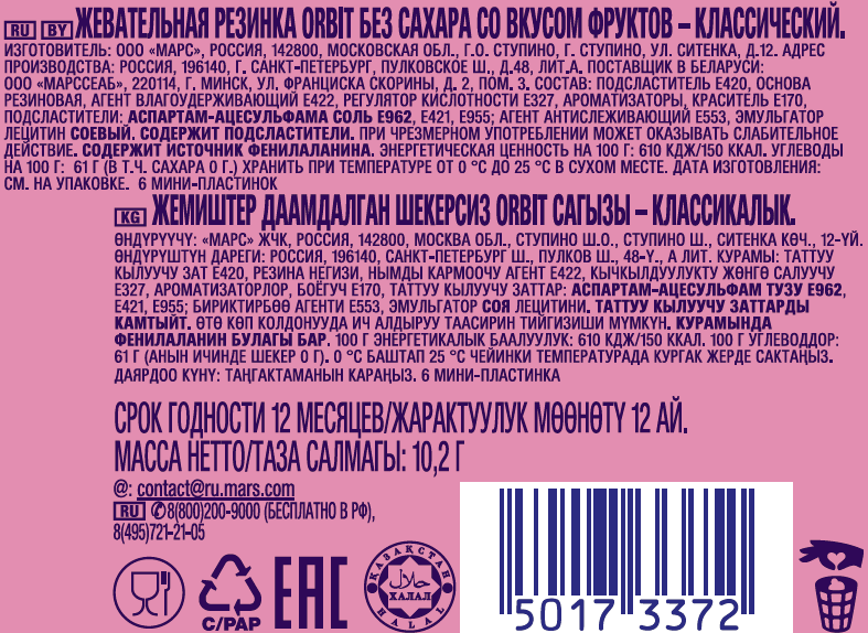 Жевательная резинка Orbit Mini классический без сахара, 10.2г