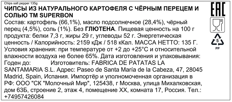 Чипсы картофельные Superbon с солью и перцем, 135г