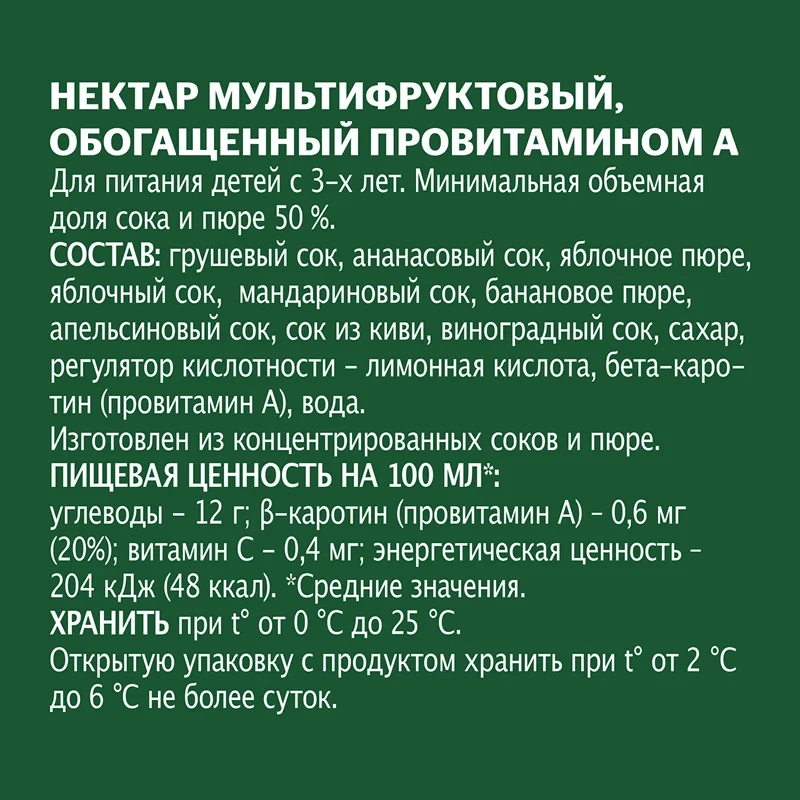 Состав: виноградный сок, апельсиновый сок, яблочный сок, яблочное пюре, мультифруктовый сок (виноградный сок, банановое пюре, мандариновый сок, сок киви, ананасовый сок), сахар, лимонная кислота, бета-каротин, вода.