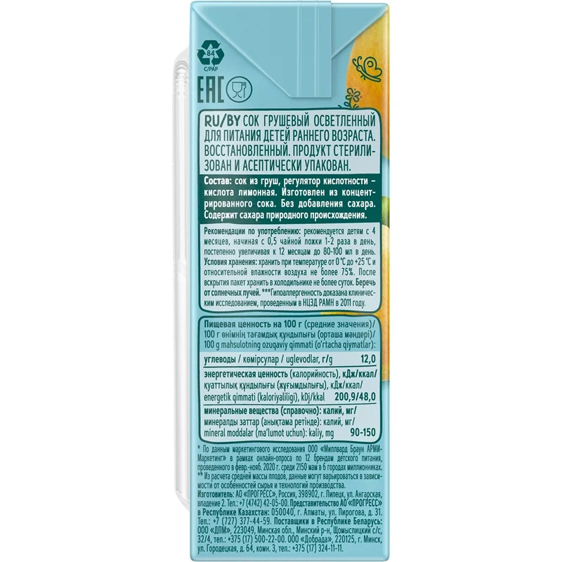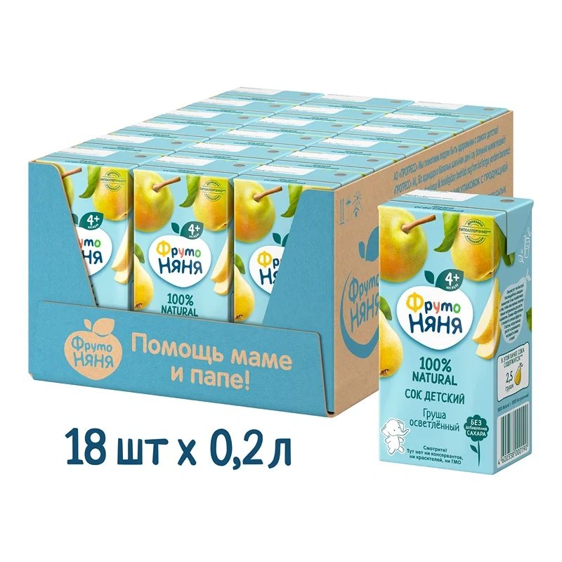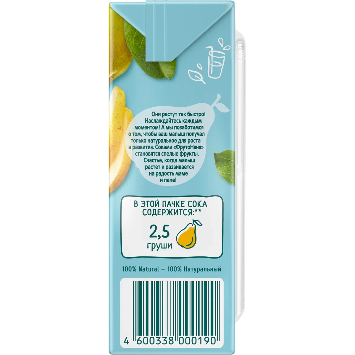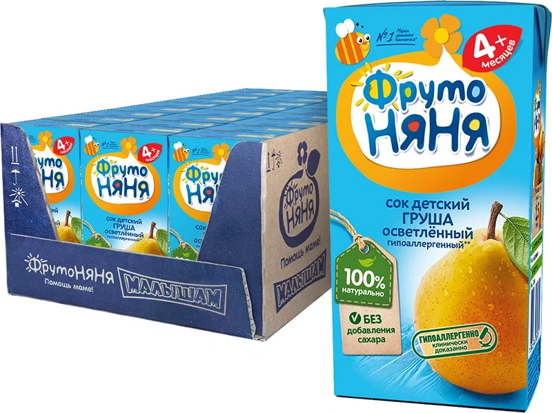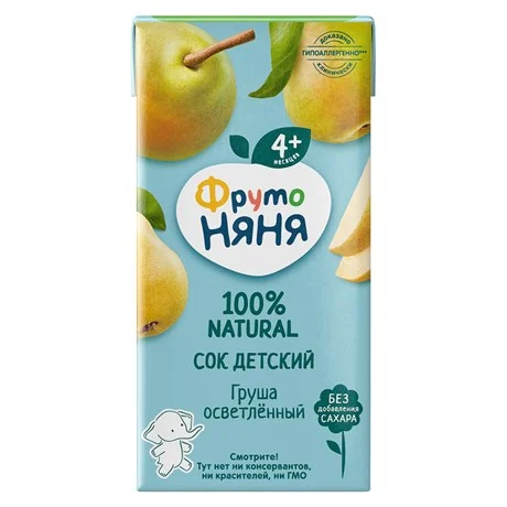 Сок ФРУТОНЯНЯ из груш осветленный без сахара, 0,2л – это гипоаллергенный натуральный напиток для детей старше 4-х месяцев, который обладает приятным вкусом, сбалансированной консистенцией и аппетитным ароматом. Находящиеся в составе полезные для организма элементы и витамины способны улучшить работу пищеварительной системы и придать ребенку сил. Напиток производится из консервированного грушевого сока. Упаковка бережно сохраняет все ароматические и вкусовые свойства товара и легко открывается. Производитель: ОАО «Прогресс», г. Липецк, Россия.Состав: сок из груш, регулятор кислотности - кислота лимонная.Без добавления сахара. Содержатся сахара природного происхождения.Рекомендуется детям с 4-х месяцев, начиная с 0,5 чайной ложки в день, постепенно увеличивая к 12 месяцам до 80-100 мл в день.Пищевая ценность на 100г продукта: углеводы – 12г.Энергетическая ценность (калорийность): 201 кДж/48 ккал.Продукт стерилизован и асептически упакован.Открытый пакет хранить в холодильнике не более суток.Срок годности: 12 месяцев.ТУ 9163-041-18008485-07.