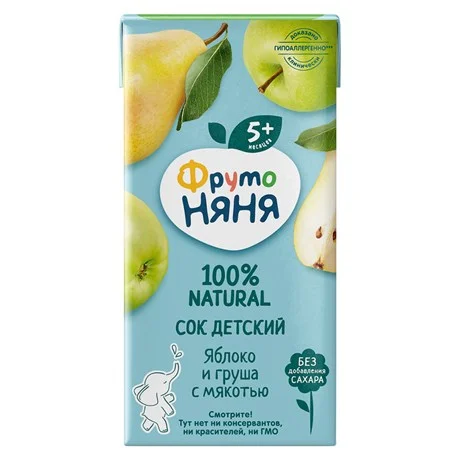Сок ФРУТОНЯНЯ из яблок и груш гипоаллергенный, 200г с мякотью – это готовый к употреблению натуральный продукт для детей старше 5 месяцев, обладающий приятным вкусом. ФРУТОНЯНЯ содержит большое количество полезных для организма ребенка элементов и витаминов. Напиток производится из концентрированных яблочных и грушевых соков и пюре. Продукт способен нормализовать работу кишечника и укрепить организм с помощью витамина C и других полезных веществ. Упаковка в виде картонного пакета надежно сохраняет все столь важные свойства напитка. Производитель: ОАО «Прогресс», Россия.Объем: 200 мл.Состав: сок из яблок, пюре из груш, сок из груш, пюре из яблок.Изготовлен из концентрированных соков и пюре. Без добавления сахара.Содержатся сахара природного происхождения.Пищевая ценность в 100г продукта: углеводы – 11,4г.Энергетическая ценность (калорийность): 191 кДж/45.6 ккал.