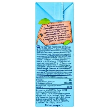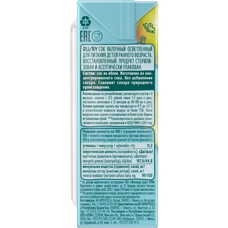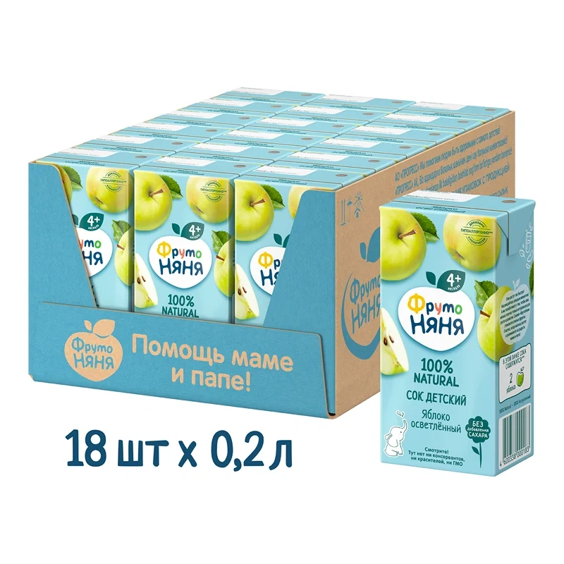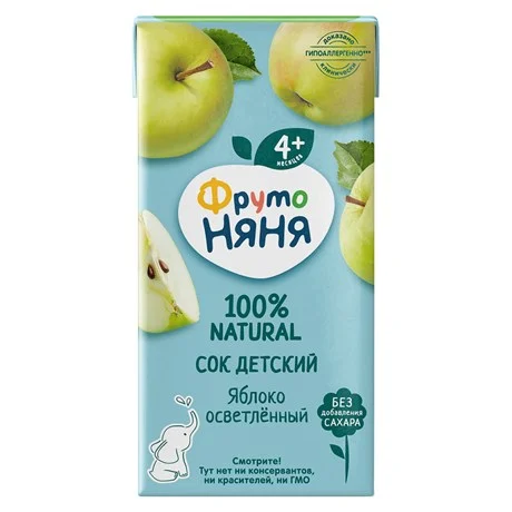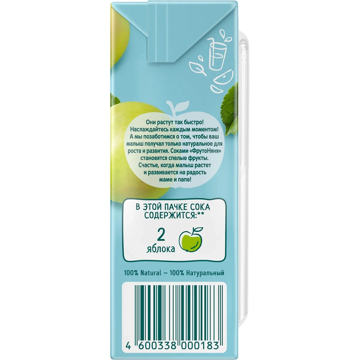 Сок ФрутоНяня из яблок гипоаллергенный, 200г для детей старше 4-х месяцев не только имеет приятный вкус и фруктовый аромат, но и является источником множества витаминов и полезных для организма элементов. Напиток состоит из натуральных ингредиентов. В составе не содержится сахара. Яблочный сок не только богат витаминами и полезными веществами, но и способен помочь в улучшении работы кишечного тракта. Красивая, удобная в хранении упаковка бережно сохраняет все лучшие свойства напитка.