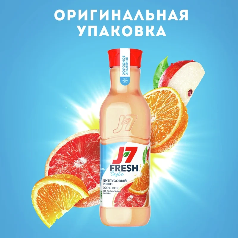 Сок холодного хранения J7 Fresh Taste Цитрусовый Микс представляет собой 100% сок из яблок, грейпфрутов и апельсинов без добавления сахара. В составе содержатся сахара природного (естественного) происхождения.