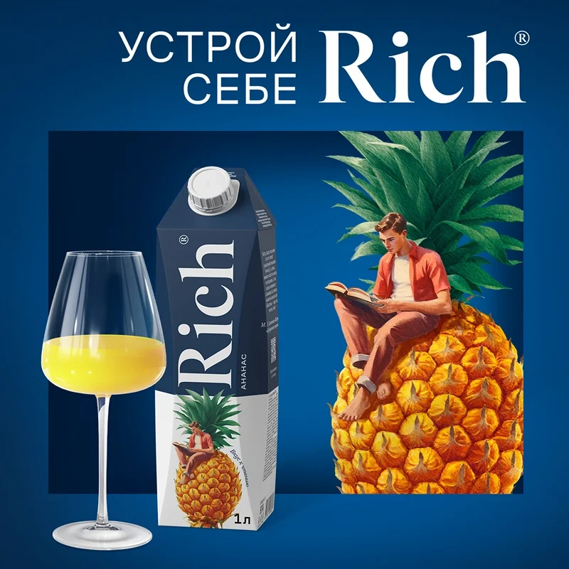 Оцените экзотическую сладость ананасового сока: неповторимый тропический вкус и тонкий аромат спелых фруктов открываются с каждым глотком Rich.