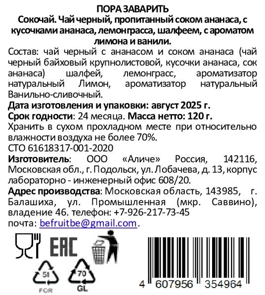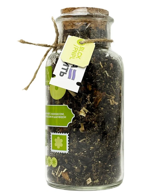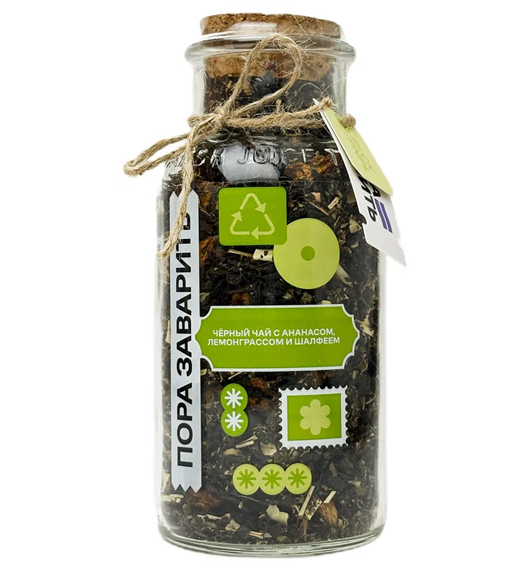 Пора заварить. Сокочай черный, пропитанный соком ананаса, с кусочками ананаса, лемонграсса, шалфеем, с ароматом лимона и ванили. Кусочки ананаса добавляют сочность и яркие фруктовые акценты, а лемонграсс дарит цитрусовую свежесть и легкость. Шалфей придает напитку глубину и утонченную пряность, добавляя к чаю теплый оттенок. Лемонграсс известен своими освежающими и тонизирующими свойствами, а шалфей помогает укрепить иммунитет. Этот чай идеален как для бодрящего утра, так и для спокойного вечернего расслабления.
