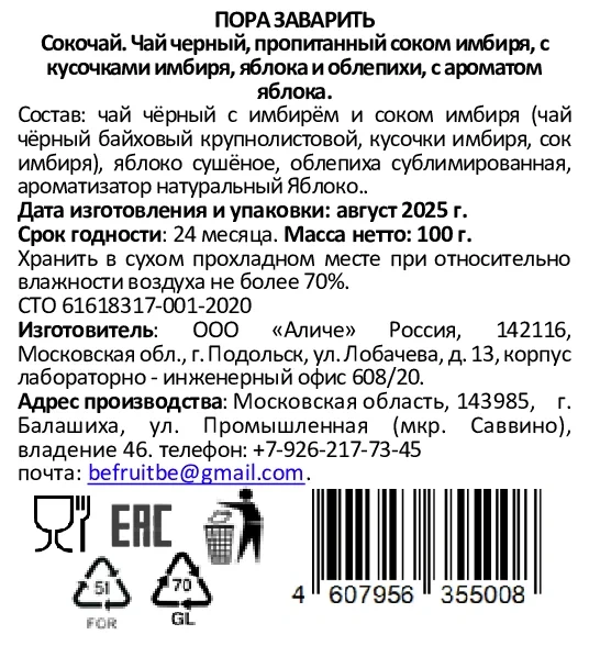 Пора заварить. Сокочай черный, пропитанный соком имбиря, с кусочками имбиря, яблока и облепихи, с ароматом яблока. Чай с имбирем необычайно полезен для организма - укрепляет иммунитет, защищает от инфекций, выводит лишнюю жидкость из организма, помогает при умственной и физической усталости, улучшает обмен веществ. Такой бодрящий напиток действует как природный антибиотик для борьбы с патогенной микрофлорой. Вкусный и напиток обязательно оценят все члены семьи.
