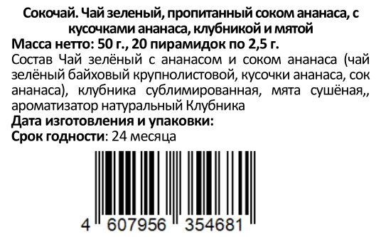 Сокочай в пирамидках. Чай зеленый, пропитанный соком ананаса, с кусочками ананаса, клубникой и мятой 50г. Черный крупнолистовой чай с кусочками ананаса, сублимированной клубникой и сушеной мятой обладает многогранной палитрой вкуса и аромата. В состав чая входят только натуральные ингредиенты, а чайные листья предварительно вымачиваются в соке ананаса: вкус напитка становится особо насыщенным и обогащенным.