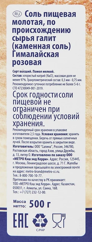 Соль Metro Chef гималайская розовая, мелкого помола, 500г