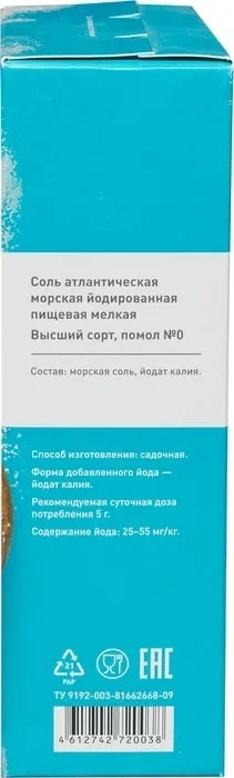 Соль пищевая 250 г 'Морская' мелкая, йодированная, пластиковая туба с дозатором, АТЛАНТИКА