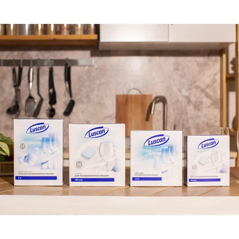 Гранулированная соль для посудомоечной машины Luscan способствует смягчению воды, защищая машину от образования известкового налета и накипи.