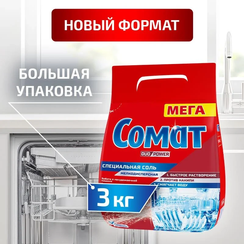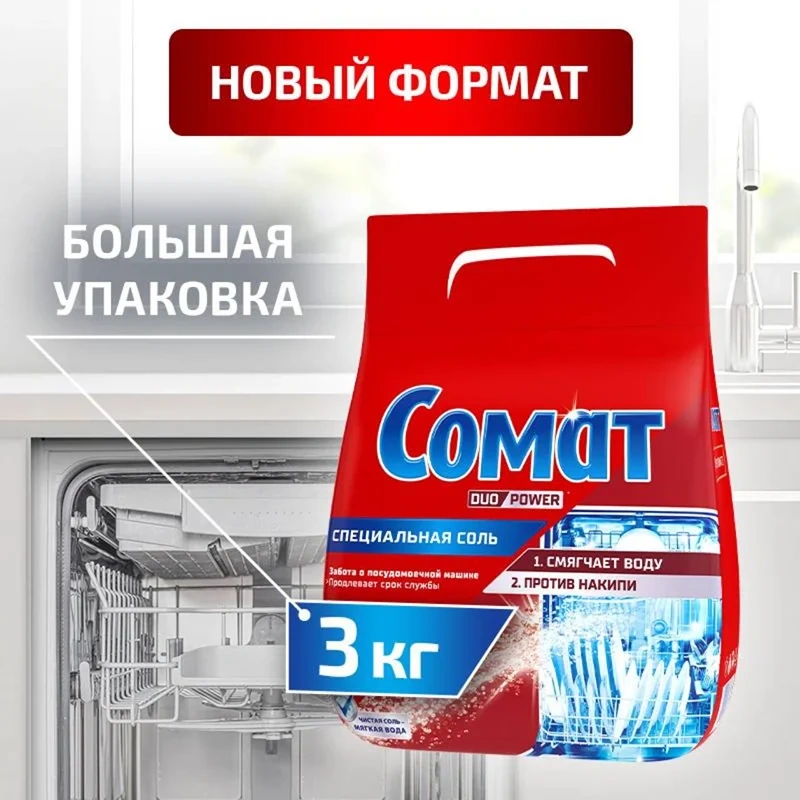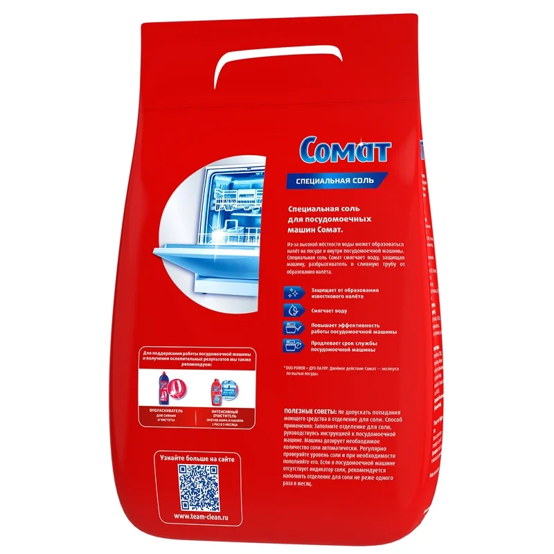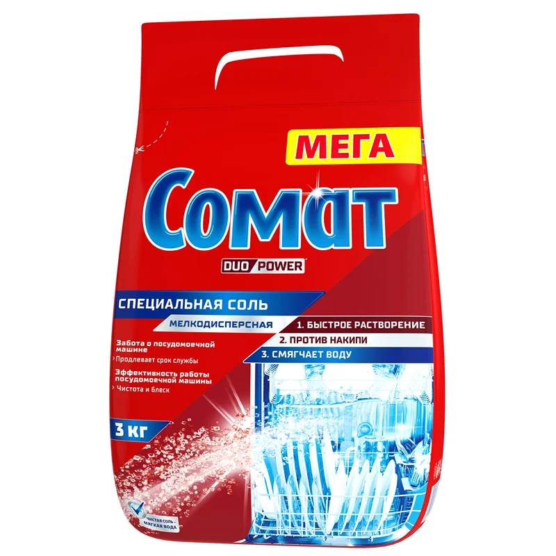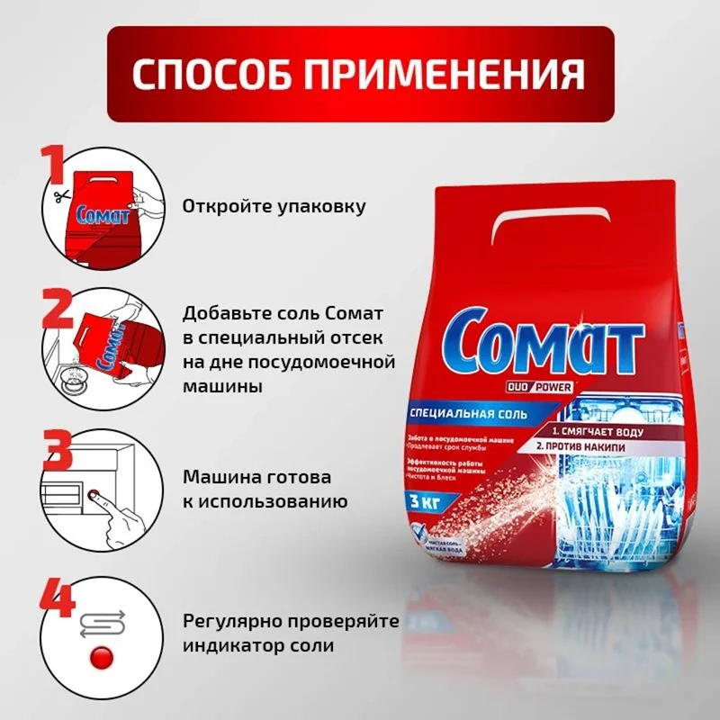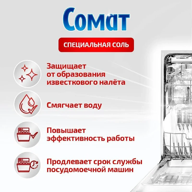 Специальная соль для посудомоечной машины Сомат смягчает воду, предотвращая образование известкового налета на разбрызгивателях и сливной трубе, тем самым соль для посудомойки продлевает срок службы Вашей посудомоечной машины. Откройте для себя 5 активных действий специальной соли для посудомоечной машины Сомат: защищает от образования известкового налёта; смягчает воду; повышает эффективность работы посудомоечной машины; соль для посудомойки предотвращает появление разводов; продлевает срок службы посудомоечной машины. Бренд Сомат разработал полный комплекс средств для посудомоечной машины, чтобы посуда сверкала чистотой, а техника служила долго и надежно.
