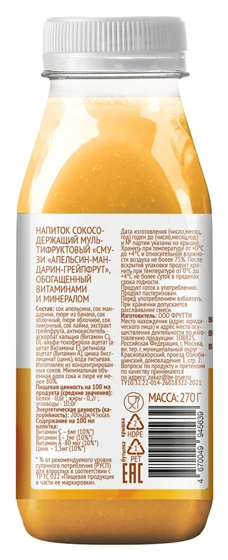 Смузи Be True Апельсин-Мандарин-Грейпфрут с витаминами, 250мл