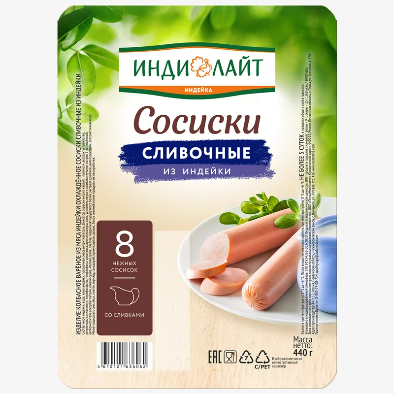 Сосиски Индилайт Сливочные из индейки, 440г – идеальный выбор для приготовления вкусных и сытных бутербродов и закусок для быстрого утоления голода в течение дня. Продукция изготовлена из отборных натуральных ингредиентов, основным из которых является мясо и кожа индейки – оно очень вкусное и полезное одновременное. В фарше из этого мяса содержится много макроэлементов (калий, кальций, магний, фосфор и др.) и витаминов. Благодаря такому богатому состав индейка способствует нормализации обмена веществ в организме и улучшению работы пищеварительного тракта. Сосиски хорошо сочетаются не только с хлебобулочными изделиями, но и различными гарнирами. Традиционно к ним подают соусы и кетчуп, в сочетании с которыми они становятся еще более насыщенными. Нежная текстура, вкус и аромат понравятся как взрослым, так и детям.