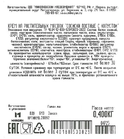 Сосиски Микоян постные с капустой, 400г