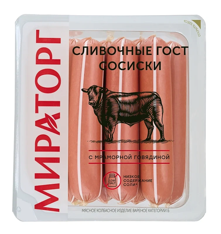 Сосиски Мираторг Сливочные, 400г – сытный продукт с высокой энергетической ценностью, идеально подходящий для быстрого перекуса и приготовления ряда блюд. Для производства используется свиная лопатка и топсайд из говядины. Благодаря этому колбасное изделие характеризуется богатым химическим составом – в нем есть ряд витаминов (в частности, группы B) и минеральных веществ (калий, кальций, магний, фосфор, натрий и др.). Для приготовления мясного фарша в него добавляются также сухие сливки. Сочная структура сверху покрыта более плотной корочкой. Продукт готов к употреблению. Из него можно сделать вкусные и сытные бутерброды. Также сосиски хорошо сочетаются с разнообразными гарнирами, например, гречкой, рисом, картошкой, и соусами. Помимо этого, их добавляют в выпечку и пиццу.