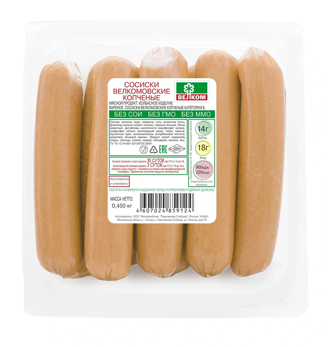 Сосиски Велком Велкомовские копченые, 450г – мясной продукт, приготовленный по классической рецептуре. Сочные, нежные с приятным вкусом копчения и пикантным ароматом. Ингредиенты, из которых состоит продукт, делают сосиски невероятно вкусными и пикантными. Плотная, равномерная консистенция без хрящей и прожилок, сосиски не разваливаются и крошатся, после варки остаются в первоначальном виде. Продукт можно употреблять, как самостоятельное блюдо, а также в виде добавки к картофельному пюре, макаронам, любой каше. Отличный вариант к пицце, можно положить в яичницу, потушить с капустой. Это любимый всеми продукт и к тому же питательный, быстро утоляет голод и насыщает положительной энергией.
