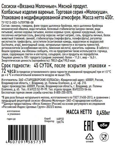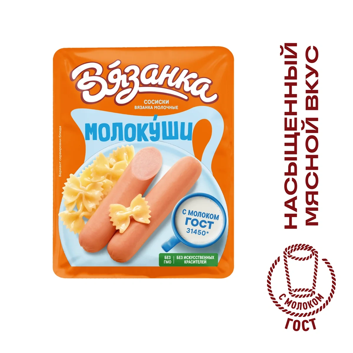 Сосиски Молокуши - в 2 раза больше натурального молока ГОСТ, а значит в 2 раза больше пользы. Аппетитные сосиски с насыщенным мясным вкусом, сочной структурой и нежным ароматом копчения, которые понравятся всей вашей семье! Сосиски Молокуши Вязанка заслужили высокую оценку заботливых мам. Приготовлены из отборного натурального мяса с добавлением двойной порции натурального молока ГОСТ для пользы и ароматных специй. Крупные, легко чистятся. Позволяют сытно, вкусно и безопасно накормить детей. Вкусные в любом виде — сыром, варёном, жареном. Их любят и взрослые, и дети за насыщенный мясной вкус, аппетитный вид и приятный аромат копчения. Их выбирают мамы за безопасный состав и натуральный мясной вкус.