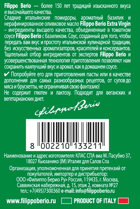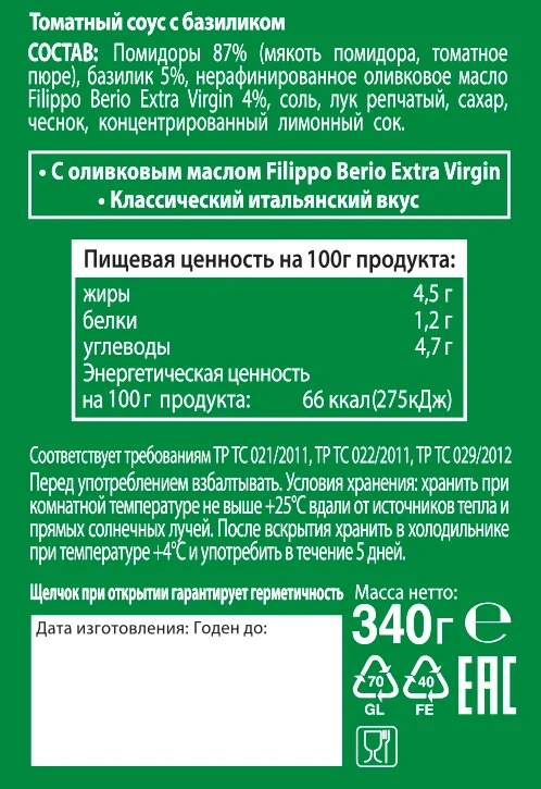 Соус, созданный для того, чтобы передать вам вкус и простоту итальянской кулинарной традиции. Без искусственных ароматизаторов, красителей и консервантов. Тщательный отбор ингредиентов от экспертов Filippo Berio и усовершенствованная технология приготовления позволяют сохранить наилучший вкус и аромат, как в домашнем соусе.
