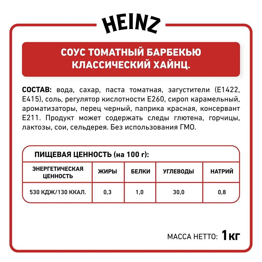 Соус Барбекю Heinz по праву входит в линейку самых популярных в мире соусов. Он обладает густой и тягучей консистенцией насыщенного бордово-красного цвета и приятным кисло-сладким вкусом с отчетливой ноткой копчености. Такой соус улучшает вкусовые характеристики, вносит пикантный акцент и удачно сочетается с самыми разными блюдами из мяса, птицы, рыбы и овощей. Его можно подавать к шашлыку и картофелю фри, свиной рульке, жареной на гриле семге, запеченной баранине или говядине, использовать для приготовления бургеров, сэндвичей и хот-догов. Продукт изготовлен на основе томатной пасты, полученной из отборных спелых помидоров.