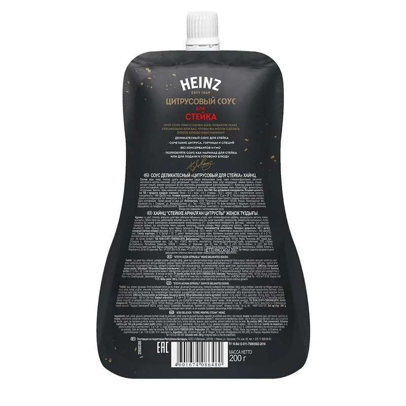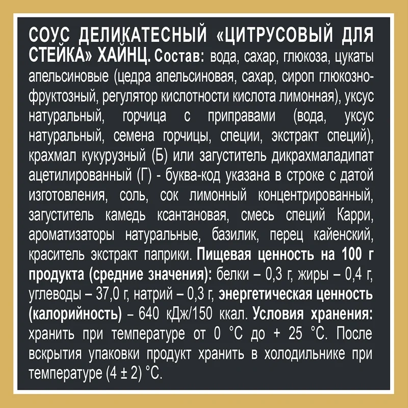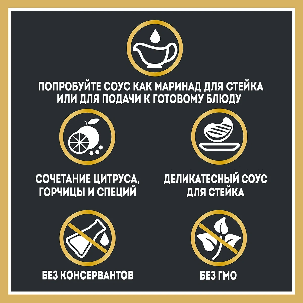 Деликатесный соус для стейка, сочетание цитруса, горчицы и специй, без консервантов и ГМО. Попробуйте подать изысканный соус как маринад для стейка или просто к готовому блюду из мяса или рыбы. Идеальное сочетание цитруса, горчицы и специй. Для пикантного аромата в нем содержатся кайенский перец, чеснок и экстракт зеленого чая. Питательный продукт с калорийностью 440 ккал используется в качестве приправы, поэтому рекомендуется умеренное его употребление. Компоненты соуса укрепляют кровеносные сосуды и защищают от сердечных заболеваний, поддерживают состояние костей, кожи. Его нечастая дегустация полезна для правильного функционирования нервной системы. В кулинарии приправа хорошо оттеняет вкус стейка, шашлыка из свиной шейки, белого мяса, шаурмы, горячих блюд азиатской кухни.