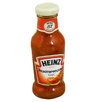 Соус Heinz Экзотический (Хайнц). Оригинальный соус Экзотический от марки Heinz. Уникальной особенностью этого соуса является его удивительный состав - помимо свежих томатов, в нем присутствует яблочный и ананасовый соки. Такое сочетание дает соусу великолепный, насыщенный вкус, аромат и характерную сладкую кислинку. Лучше всего использовать такой соус для мясных блюд и блюд из птицы. Объем: 295г.