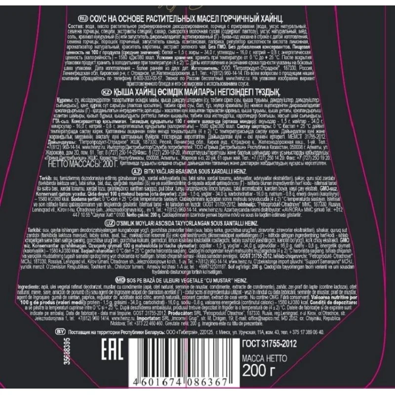 Соус Heinz Горчичный 200 г — изготовлен на основе растительного масла с добавлением порошка и целых семян горчицы (неоднородная текстура придает особую пикантность). В отличие от классической приправы имеет не такое терпкое обжигающее послевкусие и более сбалансированный состав. В меру острый и при этом сбалансированный вкус горчичного соуса Heinz преркасно дополнит мясные блюда, в том числе, приготовленные на гриле. Цельные семена горчицы придают соусу особую пикантность и необычную текстуру.