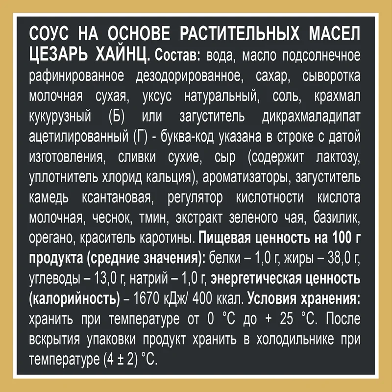 Состав: вода, масло подсолнечное рафинированное дезодорированное, сахар, сыворотка молочная сухая, уксус натуральный, соль, крахмал кукурузный или загуститель дикрахмаладипат ацетилированный, сливки сухие, сыр (содержит лактозу, уплотнитель хлорид кальция), ароматизаторы, загуститель камедь ксантановая, регулятор кислотности кислота молочная, чеснок, тмин, экстракт зеленого чая, базилик, орегано, краситель каротины.