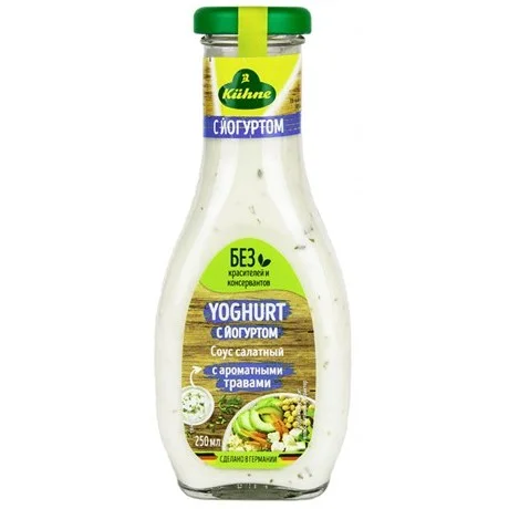 Соус Kuhne салатный с йогуртом, 250г – это восхитительный деликатесный соус, который приготовлен на основе натурального йогурта. Продукт отличается нежным сладко-кислым вкусом и неповторимым сливочным ароматом с нотками пряностей. Салатный Kuhne придает блюдам пикантный вкус и сочность. В составе отсутствуют генетически модифицированные компоненты. Выпускается соус в компактной стеклянной бутылочке объемом 250 мл, которая бережно защищает содержимое от проникновения влаги и посторонних запахов. Продукт прекрасно подходит для заправки салатов и приготовления маринадов для шашлыка.