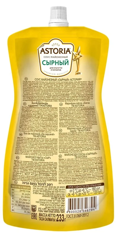 Соус майонезный Astoria Сырный 42%, 233г – это необычная приправа, которая разнообразит вкус привычных блюд и украсит ваш праздничный и будничный стол новой вкусовой палитрой. Обладает ровным и приятным цветом. Соус отличается нежным вкусом и воздушной консистенцией без аромата майонеза. Он станет идеальным наполнителем для куриных и мясных салатов, сэндвичей и основой для маринадов. Удобный формат упаковки с дозатором, сохранит свежесть продукта и позволит аккуратно его использовать до последней капли.