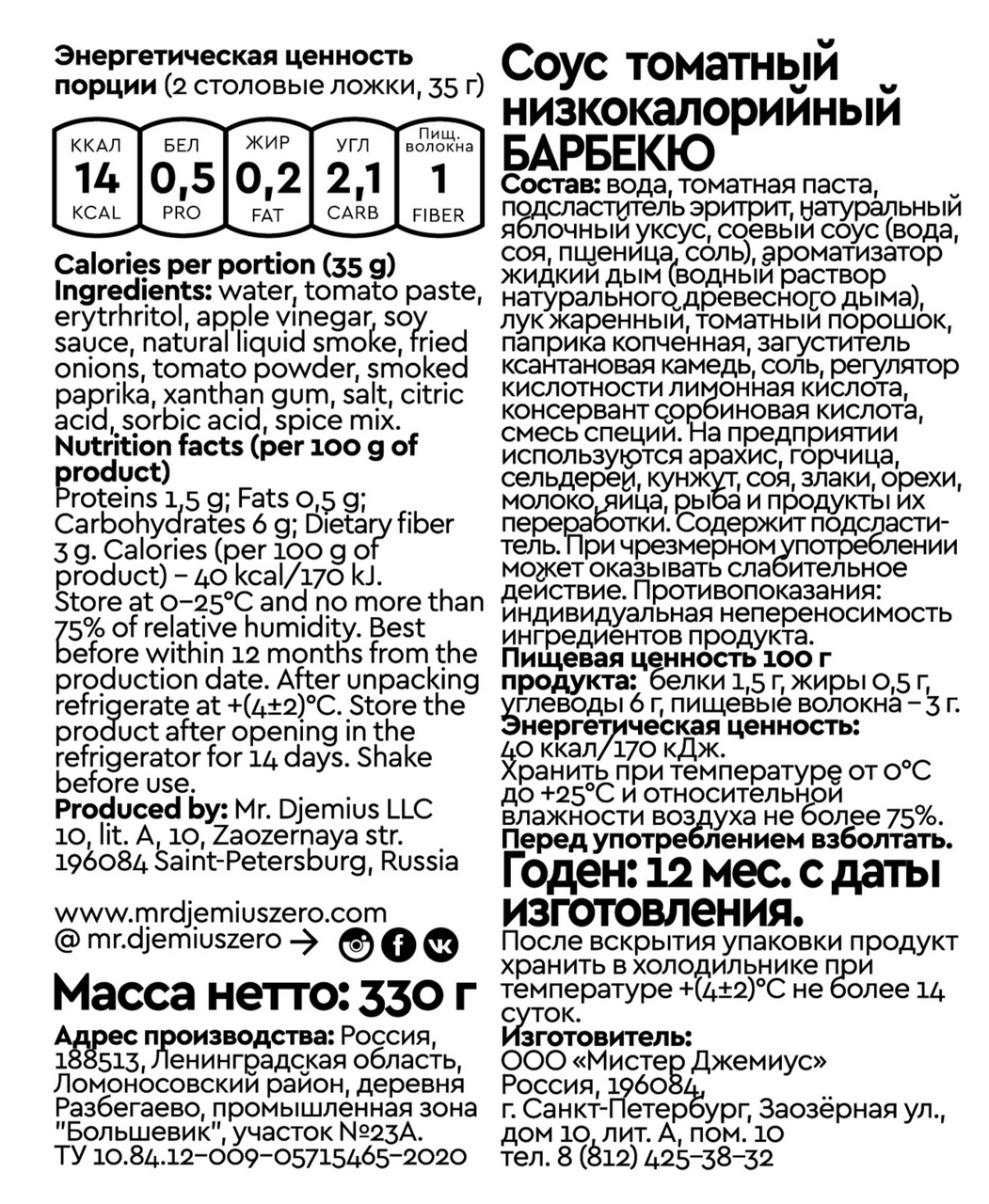 Соус Mr. Djemius Zero Барбекю низкокалорийный без сахара, 330г