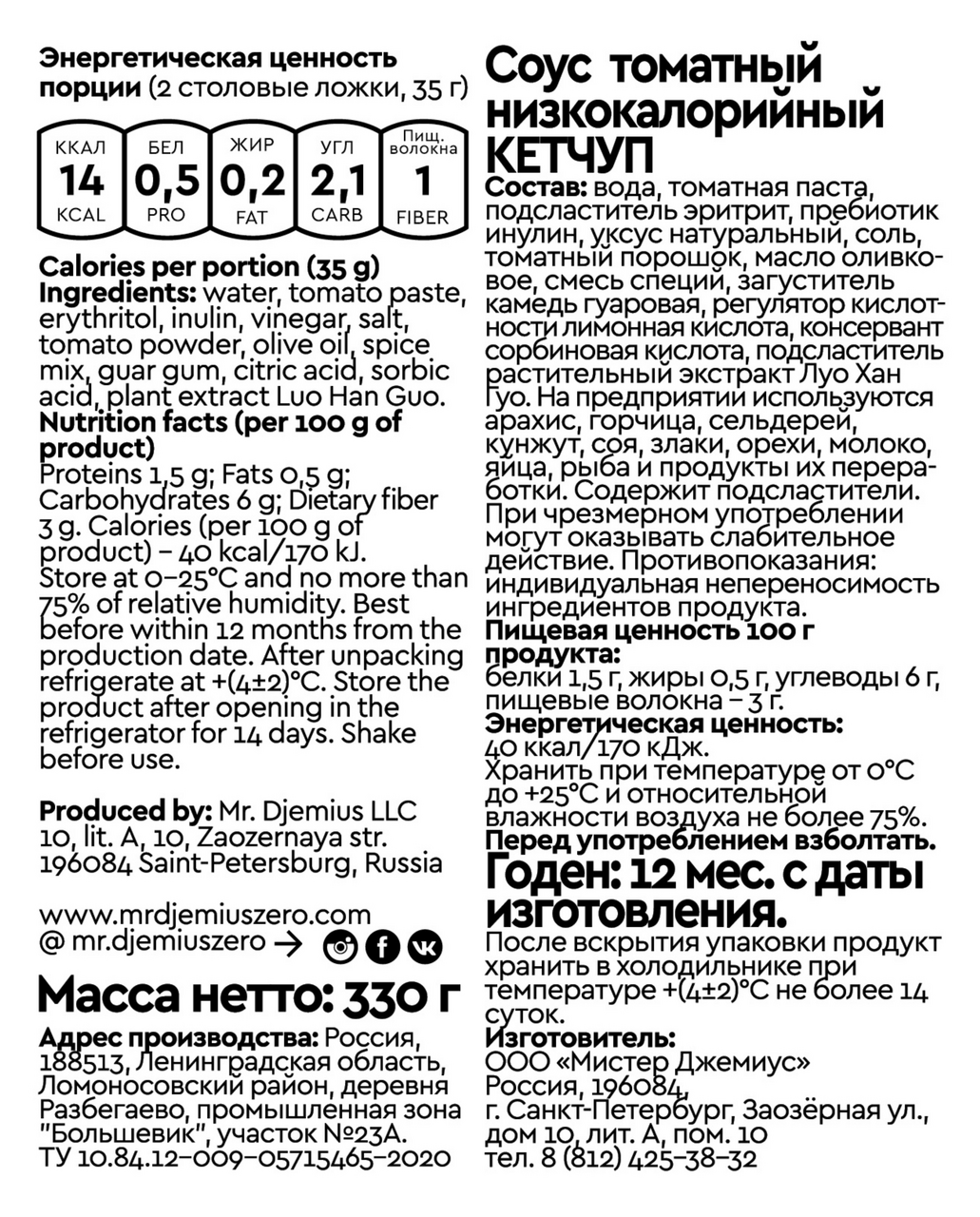 Соус Mr. Djemius Zero Кетчуп томатный низкокалорийный без сахара, 330г