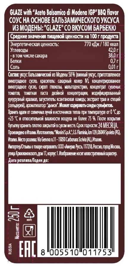 Соус на основе бальзамического уксуса Monini Glaze из Модены со вкусом барбекю, 250мл