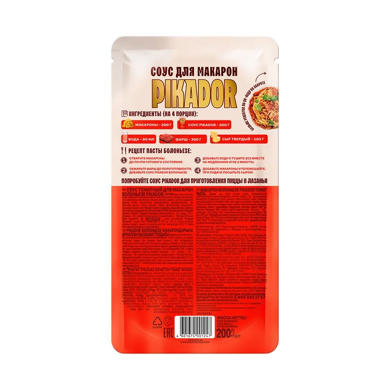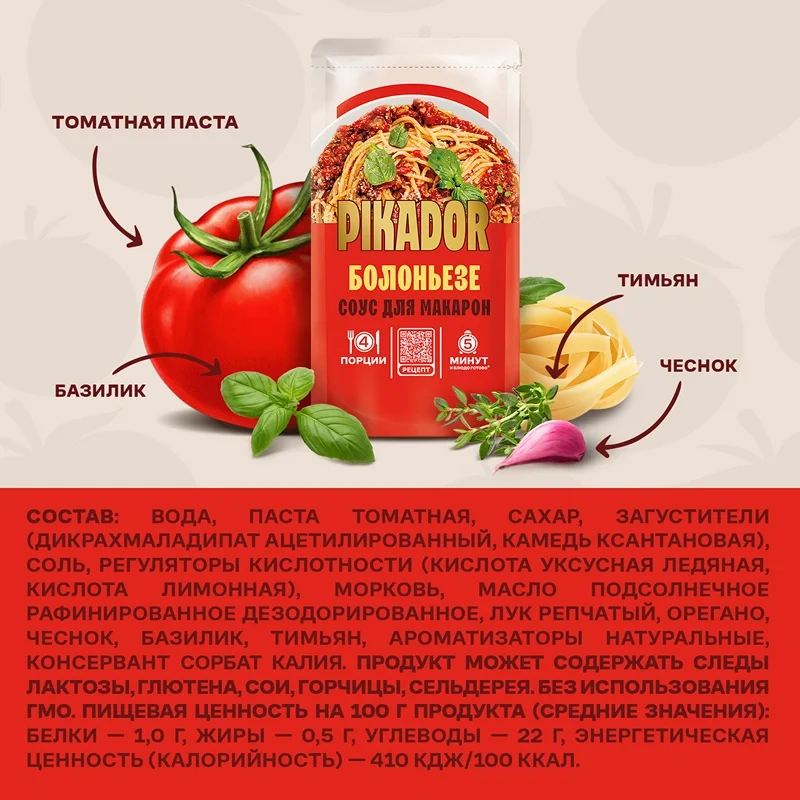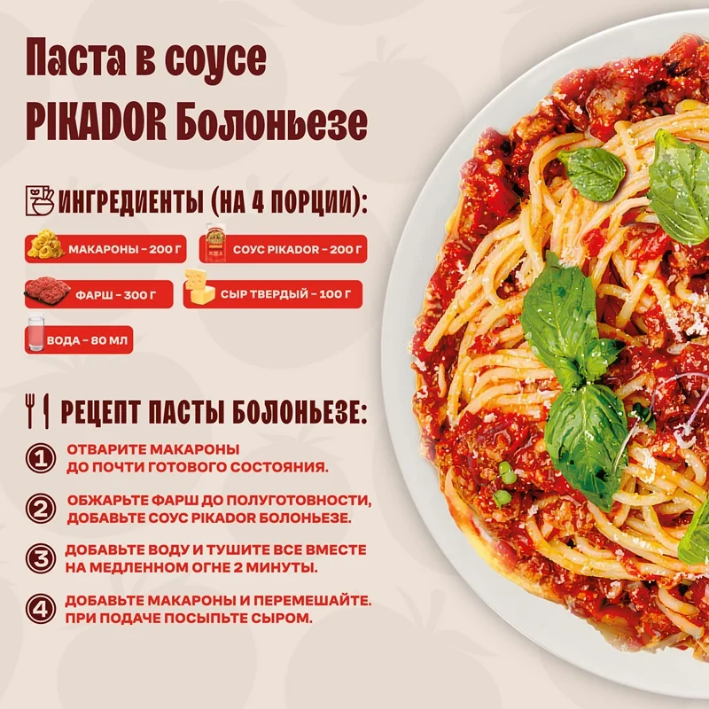 Благодаря идеальному сочетанию томатов, моркови и ароматных специй, этот соус станет незаменимым дополнением к вашим любимым блюдам из пасты или мяса. Рецепт пасты с соусом Болоньезе: 1. Отварите макароны до почти готового состояния. 2. Обжарьте фарш до полуготовности, добавьте соус Pikador Болоньезе. 3. Добавьте воду и тушите все вместе на медленном огне 2 минуты. 4. Добавьте макароны и перемешайте. При подаче посыпьте сыром. Соус для макарон представлен в удобной упаковке. Упаковка рассчитана на 4 порции, что позволяет использовать весь продукт за одно приготовление без необходимости хранить оставшийся соус в холодильнике. Производится на основе отборных томатов с добавлением моркови, чеснока, орегано, базилика и прочих ингредиентов. Обладает пикантным вкусом и насыщенным ароматом. Прекрасно сочетается со всеми видами макаронных изделий, а также с мясными блюдами. Не содержит ГМО и красителей. Обратите внимание: рецепт вкуснейшей пасты представлен на обратной стороне упаковки.