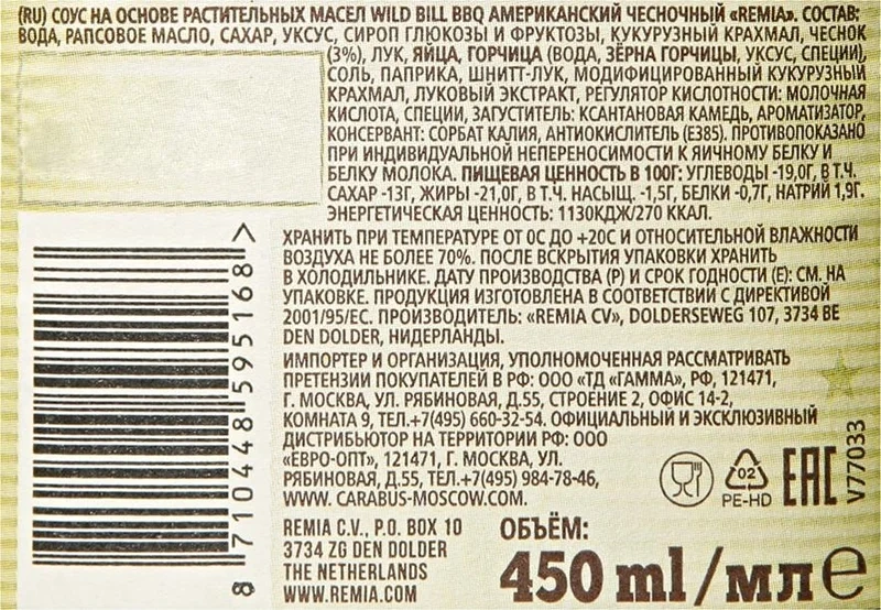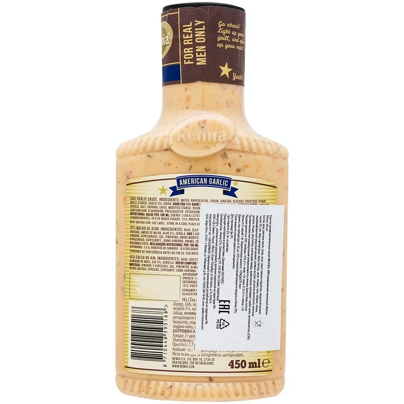 Соус Remia американский чесночный bbq, 450 мл – изысканная сливочная приправа с чесноком, в составе которой неповторимый букет трав и специй, что придает блюдам, приготовленным на мангале или решетке, более изысканный вкус и аромат. Его можно использовать при приготовлении ребрышек, свинины, говядины, сосисок и колбасок, гамбургеров, рыбы, морепродуктов. Удобный формат упаковки позволяет взять приправу на загородный пикник, также можно использовать соус в домашнем приготовлении привычных блюд на сковороде или в духовке.