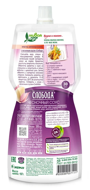 Слобода Чесночный — нежный соус с добавлением кусочков настоящего молодого чеснока. Соус изготавливается только из натуральных ингредиентов, которые проходят тщательный контроль качества. Густой и сливочный соус Слобода подчеркнет достоинства любого блюда. Он прекрасно сочетается с картофелем, любым мясом и птицей, а также идеально подойдет в качестве соуса для шаурмы и бургеров. С соусом Слобода ваши рецепты заиграют новыми красками! Слобода — бренд, который знают и любят многие россияне уже на протяжении 30 лет. Все продукты Слобода производятся с использованием бережных технологий и современного оборудования. Они не просто соответствуют ГОСТу, а обладают настоящей силой природы и изготавливаются с заботой о будущем!