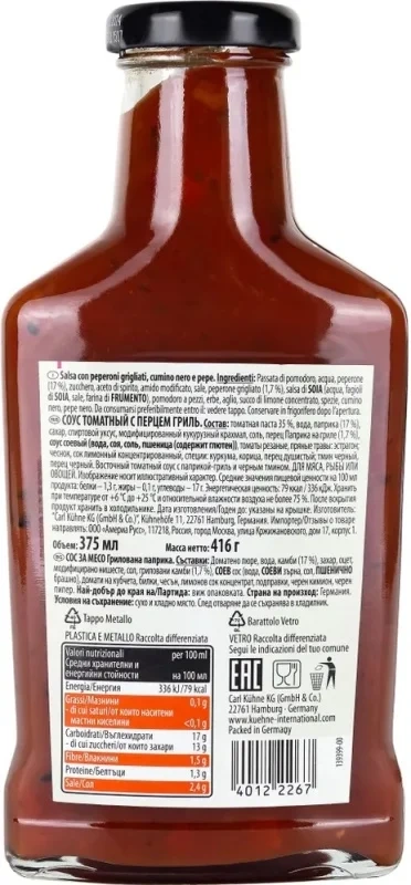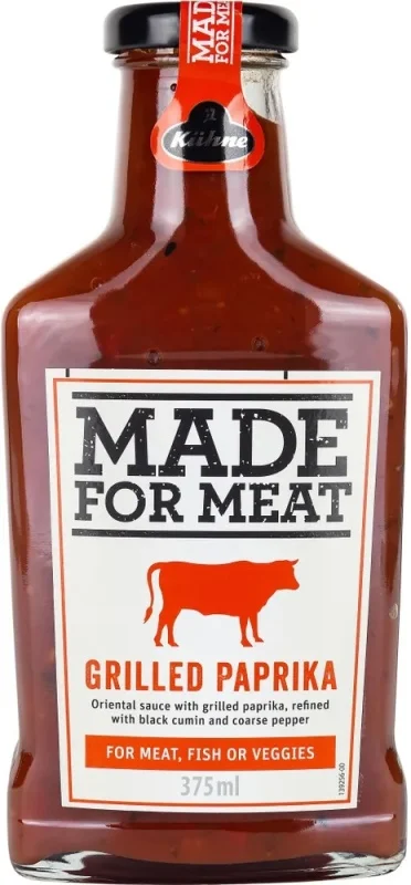 Grilled Paprika Made for Meat томатный соус с изюминкой в премиальной линейке Made for Meat от немецкого производителя Kuhne. В его составе резаные сочные мясистые томаты и большое количество паприки, оригинальность в том, что ее часть заранее приготовлена на гриле, это дает особенный аромат барбекю, а добавленные пряные специи, эстрагон, черный тмин, корица, душистый перец и чеснок вносят в него восточные оттенки. Такой соус прекрасно преобразит вкус блюд из мяса, птицы или овощей.