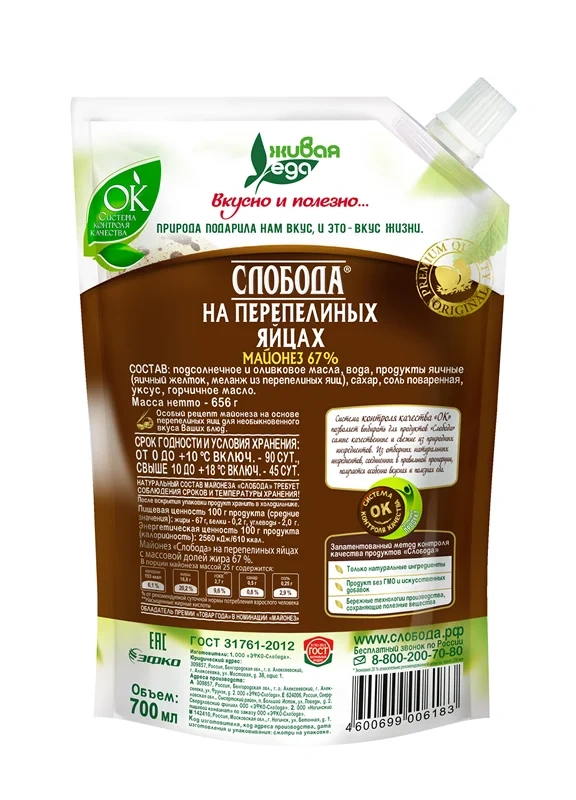 Майонез Слобода На перепелиных яйцах, 700мл, 67%