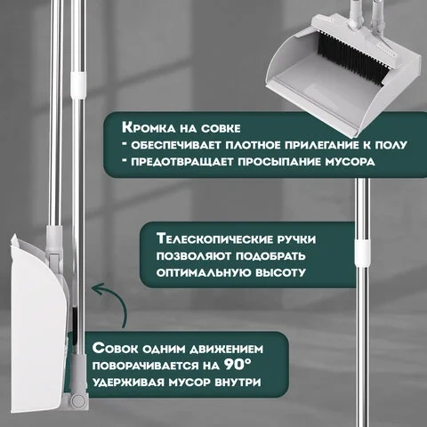 Ручка щетки вращается на 180°. Это позволяет добраться до самых труднодоступных мест во время уборки. Ручки щетки и совка регулируются по длине, что позволяет подобрать оптимальную высоту для комфортной уборки.