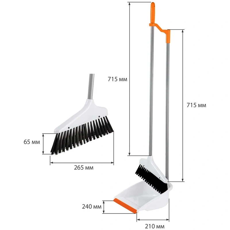 Материал совка: пластик, резина. Материал основы щетки: пластик. Материал щетины: синтетическое моноволокно. Материал ручек: металл. Длина ручек: 71,5 см. Размер совка: 21 х 24 см. Ширина щетки: 26,5 см. Длина щетины: 6,5 см. Цвет: бело-оранжевый. Вес: 374 г.