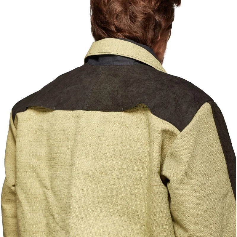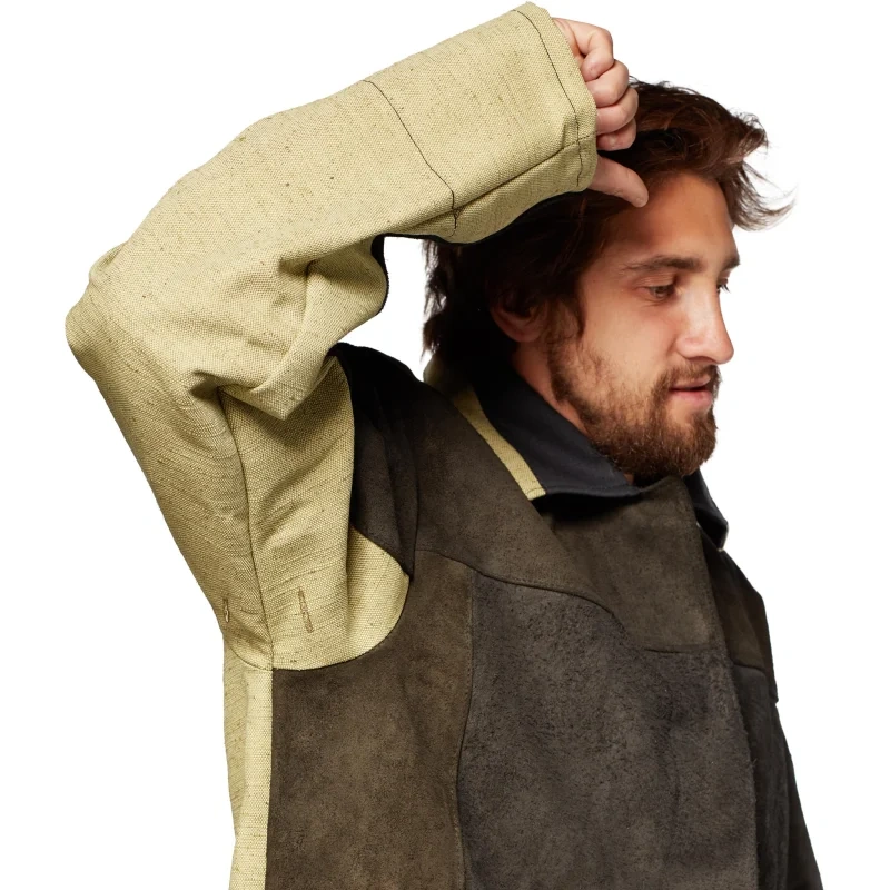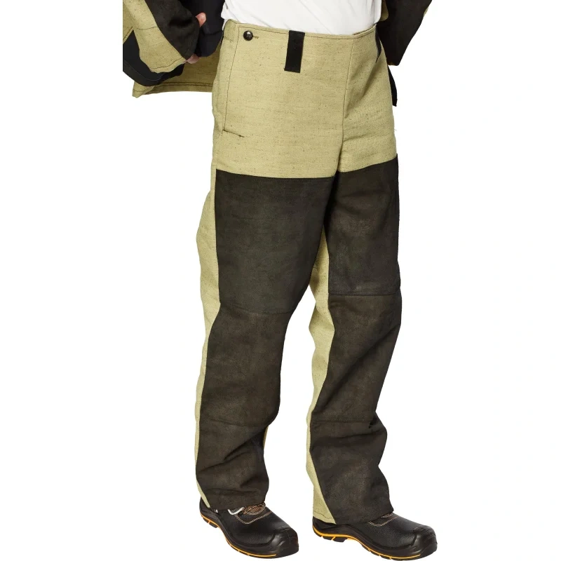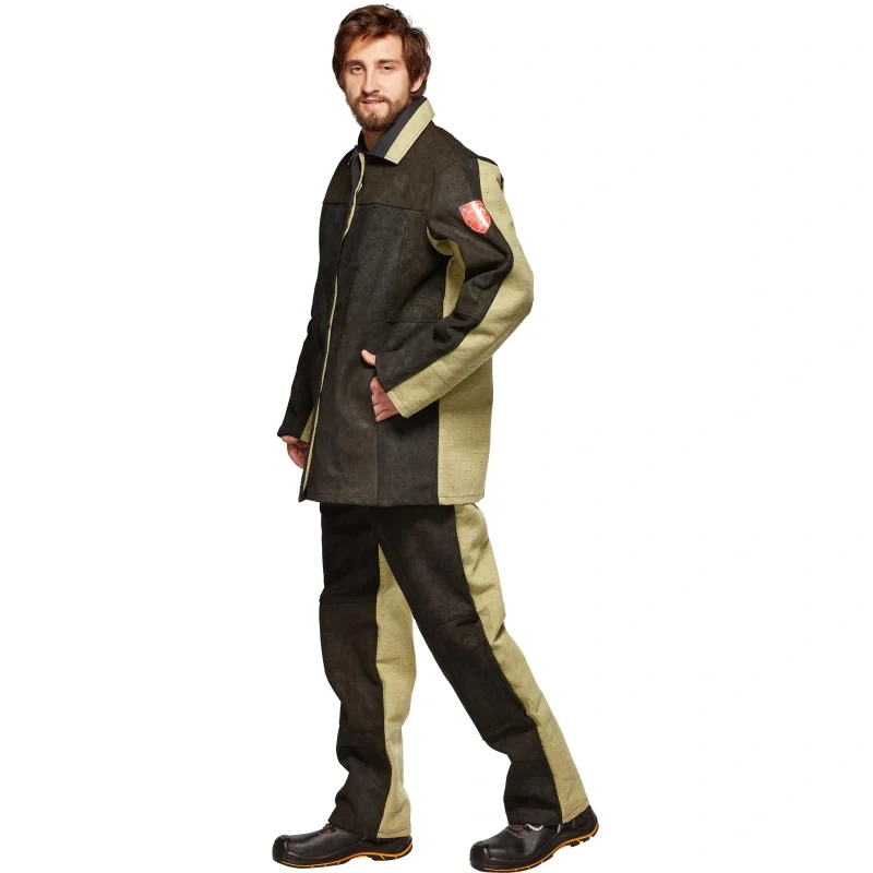 Костюм состоит из комбинированных материалов: брезент (47% хлопок, 53% лен) с огнестойкой пропиткой плотностью не менее 500 г/кв.м. и накладок из спилка КРС толщиной 0.9-1.1 мм. Основной материал: брезент с огнестойкой пропиткой и накладки из спилка КРС обеспечивают высокий уровень защиты от сварочных искр и брызг.