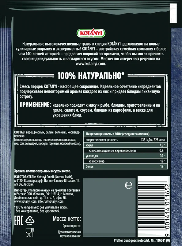Приправа Kotanyi Смесь перцев дробленая, 12г