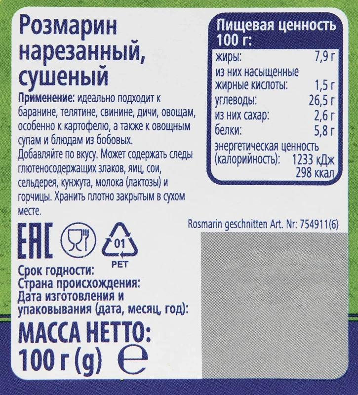 Приправа Metro Chef Розмарин нарезанный, 100г