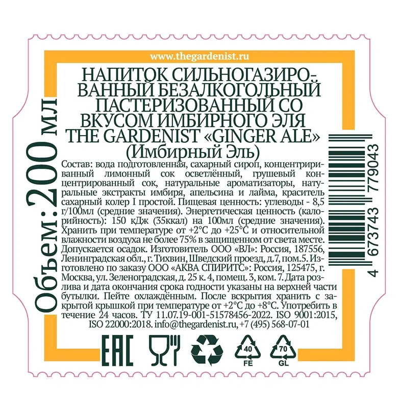 Напиток The Gardenist Имбирный эль тоник газированный, 200мл x 20 шт - премиальный имбирный эль с на...