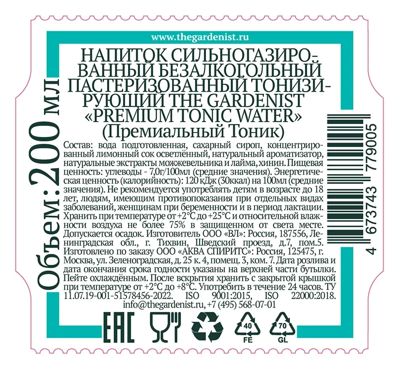 Премиальный тоник, приготовленный на основе натуральных трав с добавлением хинина и сладковатого аро...