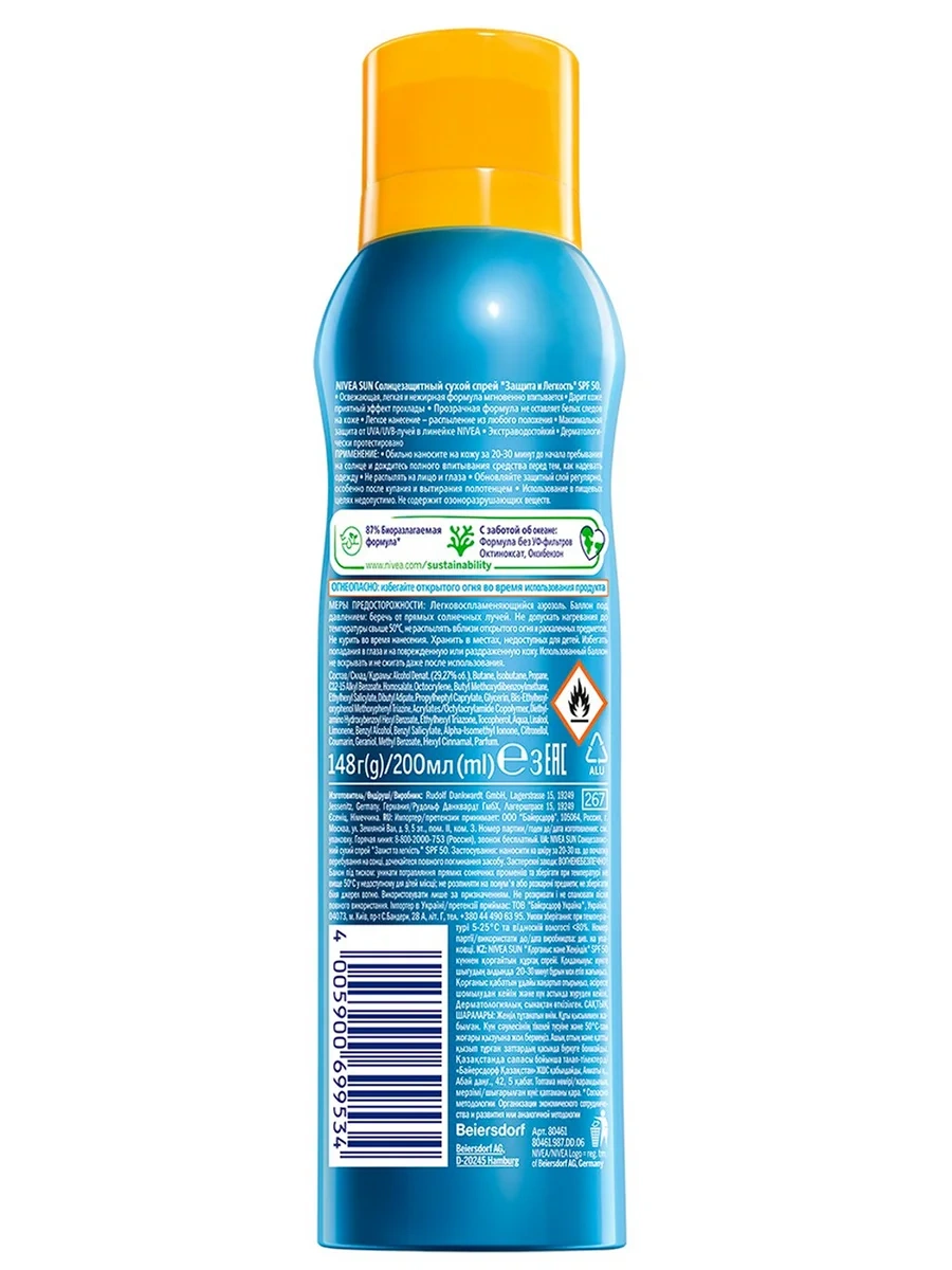 Освежающий солнцезащитный спрей Защита и легкость оказывает на кожу охлаждающий и освежающий эффект, делая ее гладкой, как шелк. Легкая увлажняющая формула быстро впитывается, без липкого эффекта. Высокоэффективная система защиты от UVA/UVB- лучей защищает кожу сразу после применения. Водостойкий. Спрей в формате аэрозоля легко наносить из любого положения, под любым углом.