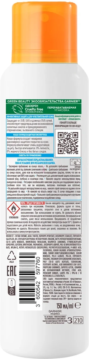Garnier Ambre Solaire сухой спрей Эксперт защита SPF 50+ для бережной защиты от UVB-, UVA- и длинных UVA-лучей. разработан специально для тех, кто не любит наносить на кожу крем или масло. Ультралегкая текстура средства мгновенно впитывается, не оставляя чувства липкости, жирности и белых следов. Надежно защищает от ультрафиолетовых лучей всех типов (UVA и UVB), предотвращая появление солнечных ожогов и признаков раннего фотостарения, вызванных чрезмерным загаром. Технология Netlock с микрокристаллами обеспечивает ультратонкое равномерное покрытие, устойчивое к воздействию воды (до 40 минут). Гипоаллергенный состав не содержит компонентов животного происхождения и подходит для всех типов кожи лица и тела.