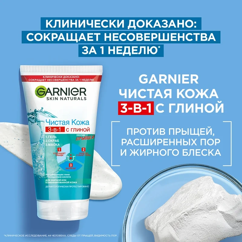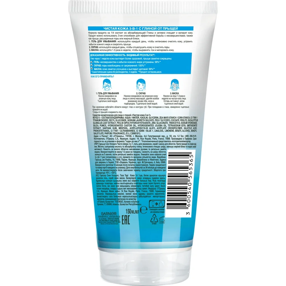 Средство для лица Garnier Чистая Кожа 3в1 гель + скраб + маска, 150мл