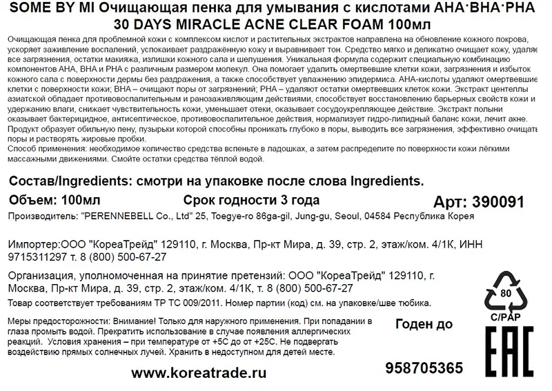 Пенка для умывания Some By Mi AHA-BHA-PHA 30 Days Miracle Восстанавливающая, 100мл